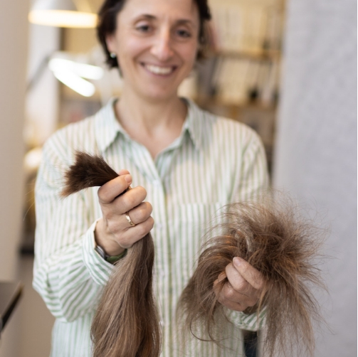 Wir sammeln Haare für Menschen, die an krankheitsbedingtem Haarausfall leiden. In der Capilli-Haarwerkstatt entstehen vor Ort in Handarbeit passgenaue Haarteile und Perücken. Damit später nichts verfitzt müssen die gespendeten Haare in einer Haarveredelungsfabrik „entschuppt“ werden. Die weitere Herstellung findet nur in unseren Händen statt. Jede Haarspende reduziert den Preis des fertigen Haarersatzes enorm. Dafür ist die Freude der neuen Besitzerin dann umso größer.